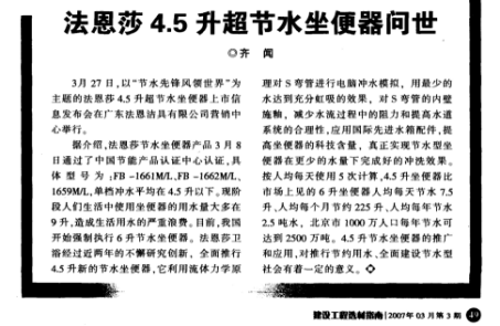 *2007年,法恩莎4.5升超節(jié)水座便器問世,遠遠達超國家節(jié)水產(chǎn)品6升的標準