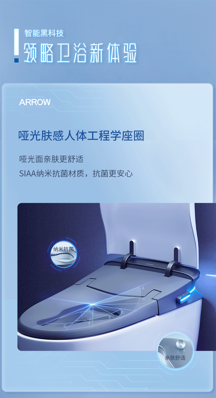 為滿足消費者對節(jié)水、抗菌、沖水力度、舒適度、健康等多種需求,箭牌在智能坐便器上使用的創(chuàng)新技術也在不斷更新。